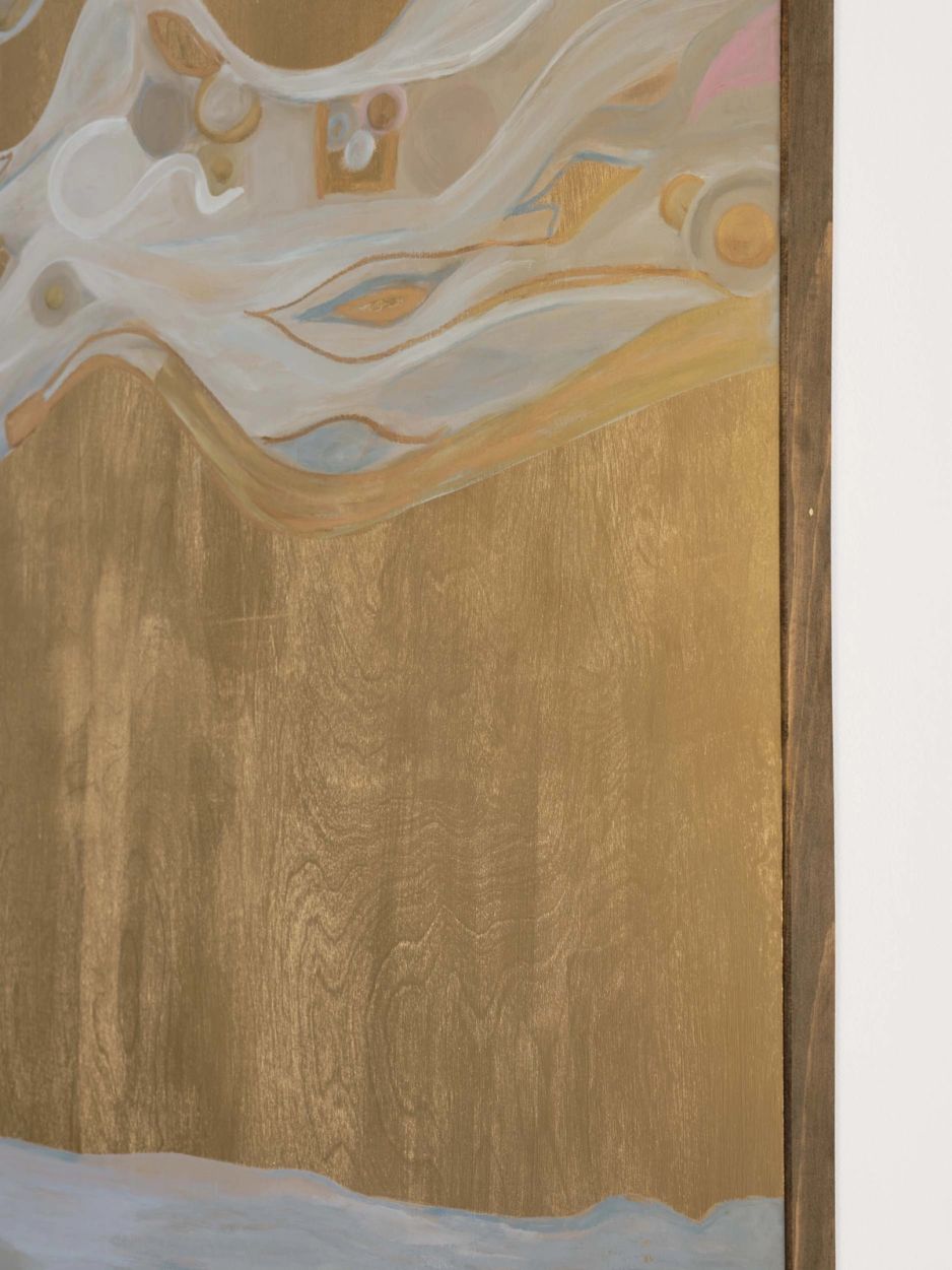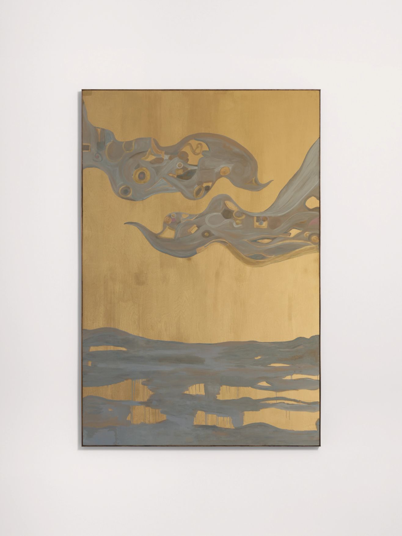 Ash RobertsMarch Thaw (2026)framed: 184h × 123w cmAcrylic, oil, oil stick, gold leaf, gold pigment on birch panel
