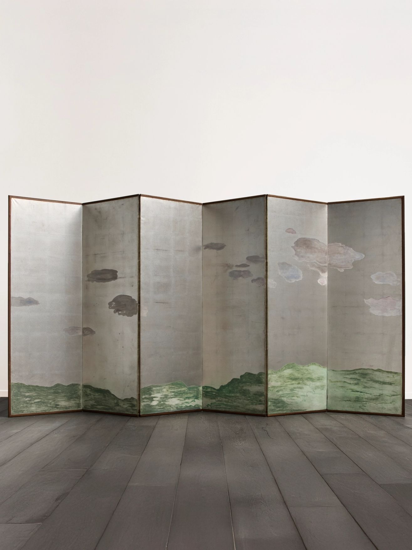 Ash RobertsMujō (2025) 171.5h × 381w cmAcrylic, oil, oil stick and silver leaf on Byōbu