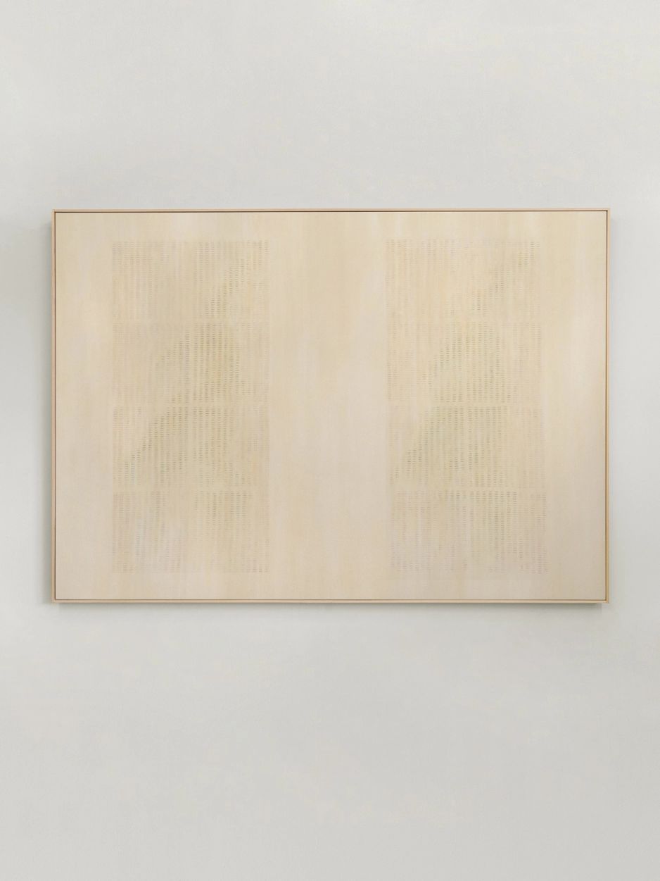 London-based artist Liam Stevens works in layered pigment washes with pencil on canvas, and constructed reliefs. His creations are composed of repeated lines and forms, creating a sense of rhythm in the negative space.