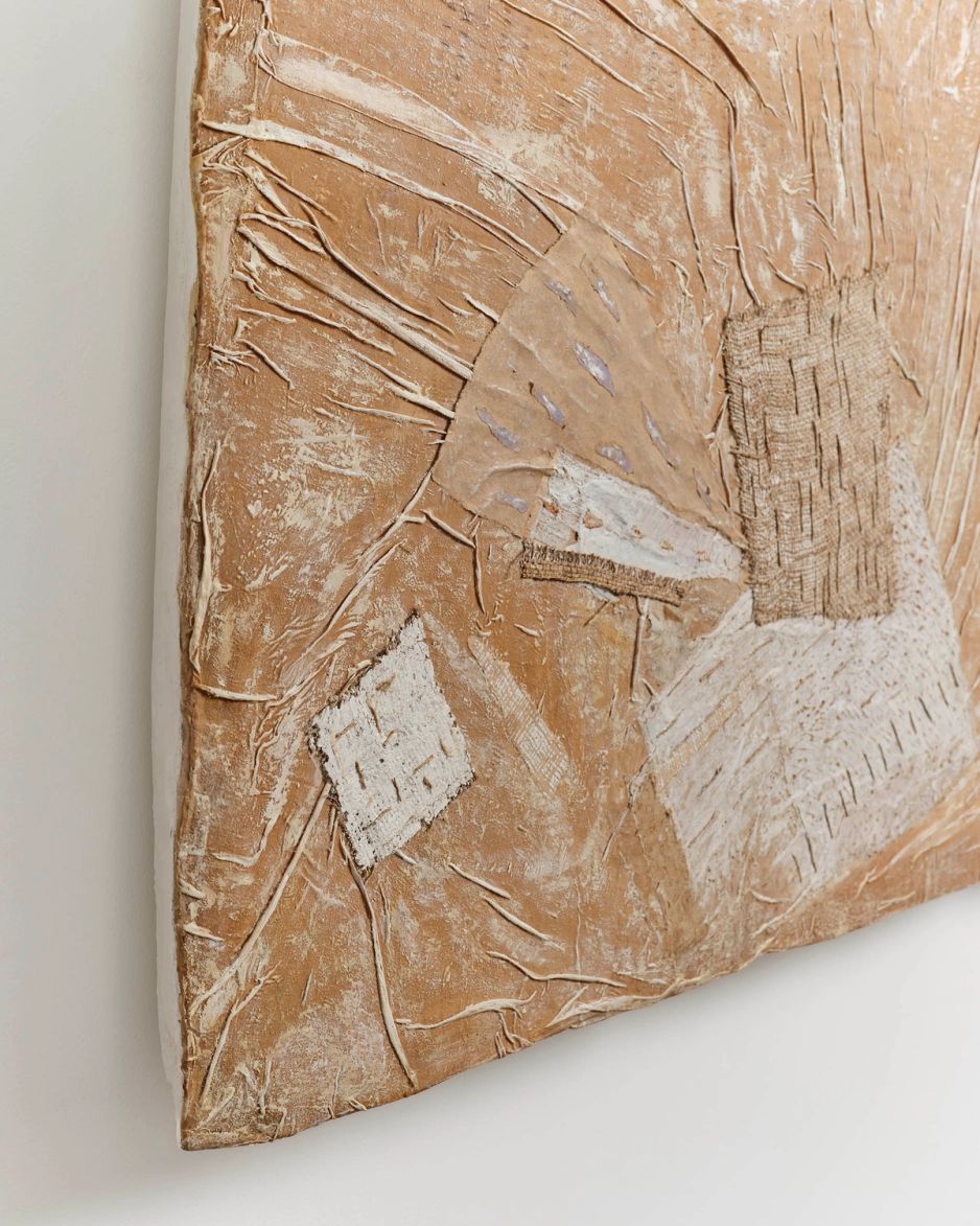 Myoung Ae LeeWork2409- Variation (2024) 83h × 138.5w × 7d cmCollage on shaped canvas / cotton, gunny, burlap cord, paper, oil color, modeling paste, pencil, purified poppy oil, color pencil