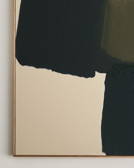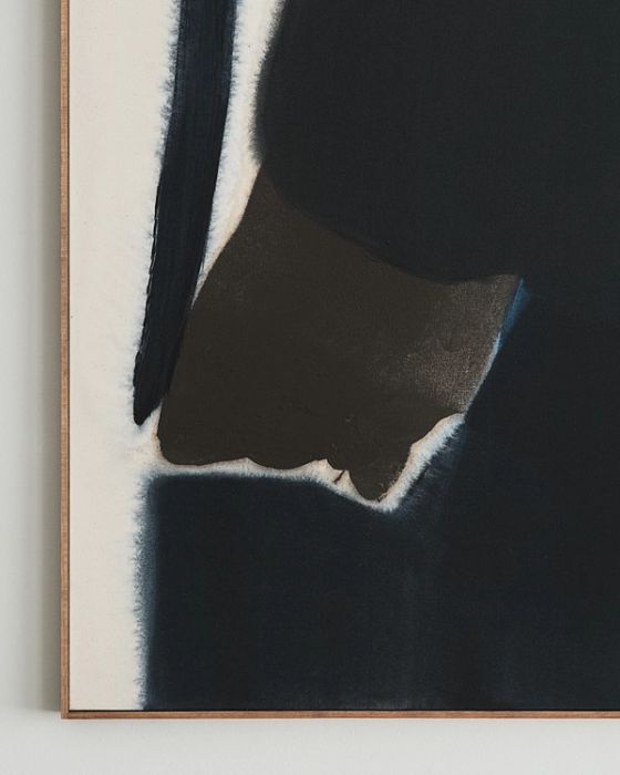 Making use of a limited palette of saturated yellow and brown ochre, contrasted against deep blues, greens and burgundy, the compositions are often graphic, and activated by fragmented shapes, textures and negative space. Some colours are kept in separate blocks with the precision of a screen print, while others bleed at the edges, overlapping and coalescing.