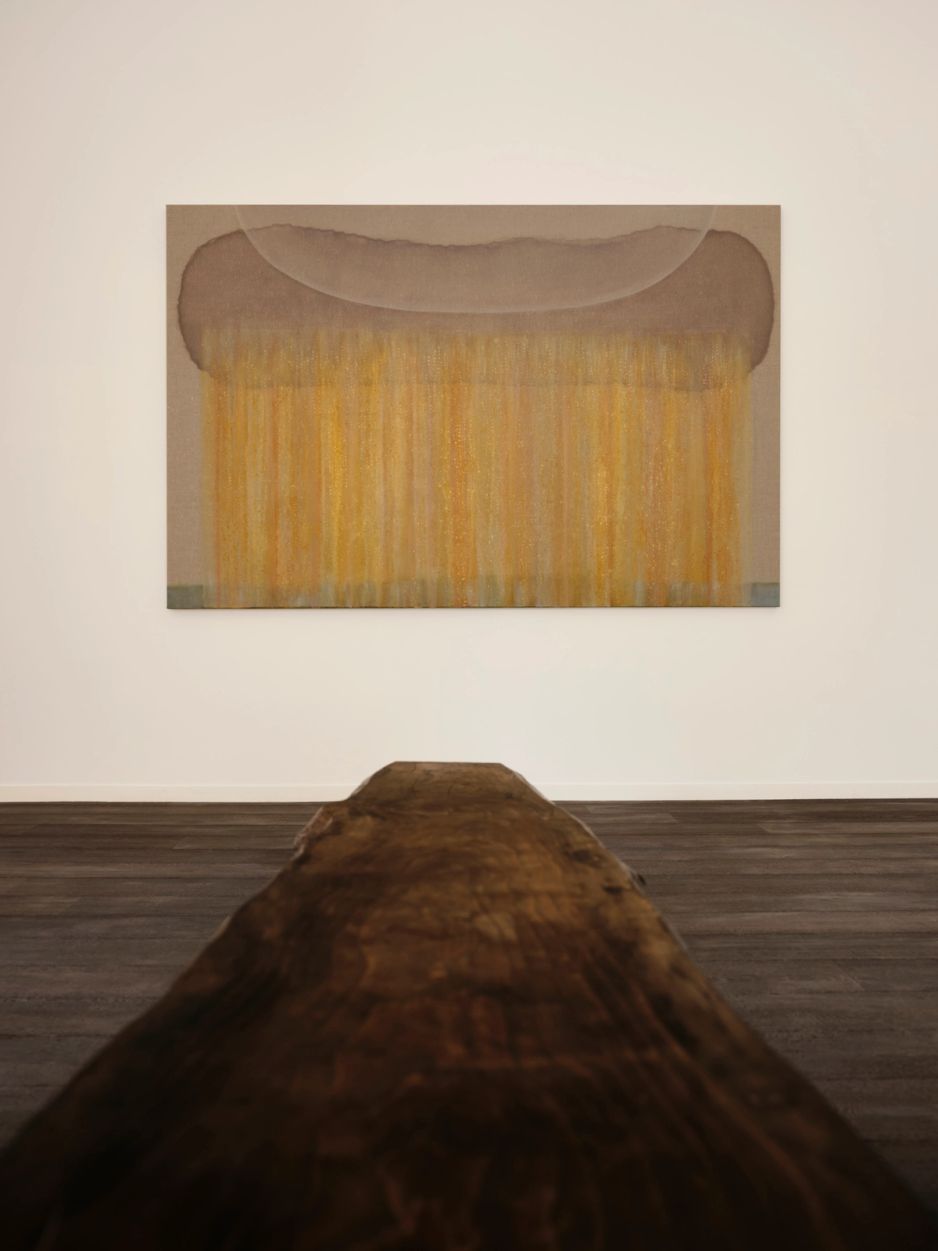 The large ovoid at the center of Savouring Silence II is an expanding mass that presses up against the physical boundary of the canvas. The shell-pink center merges, seamlessly, into the earth-toned ground, its shape distinguished only by a gentle yellow tint at its edge, and a frilled line that radiates outwards like the sun’s rays. Another painting from the same series—Savouring Silence VIII—recalls the romance of the Rococo period, with an outsized cellular form, painted in pearl-tones, set against a cloud-strewn sky. Bringing together both abstract and figurative elements, the combination produces a soft, surrealist dreamscape.