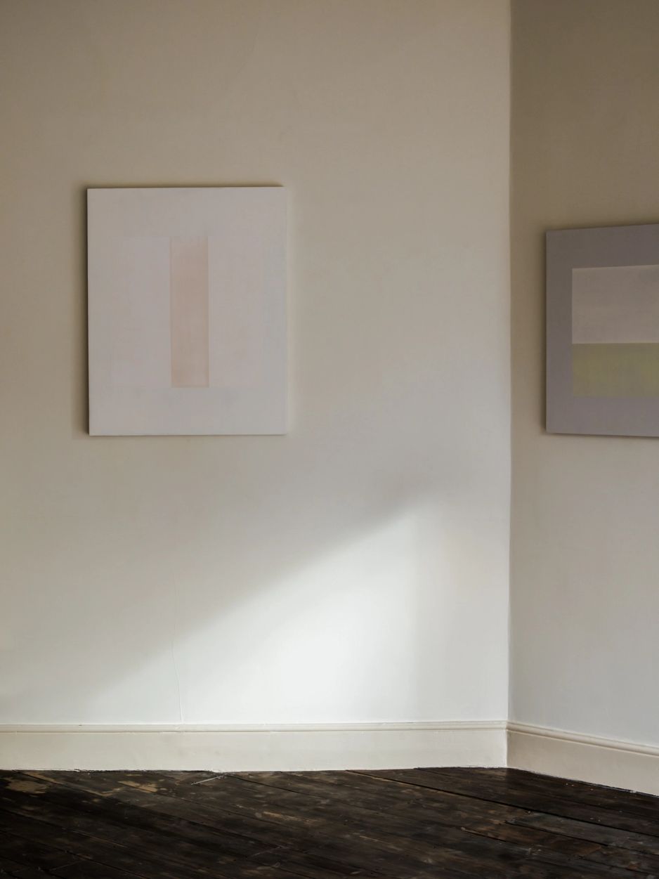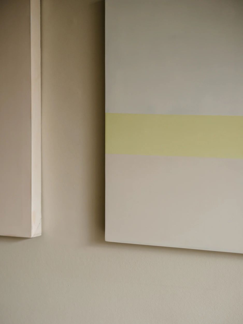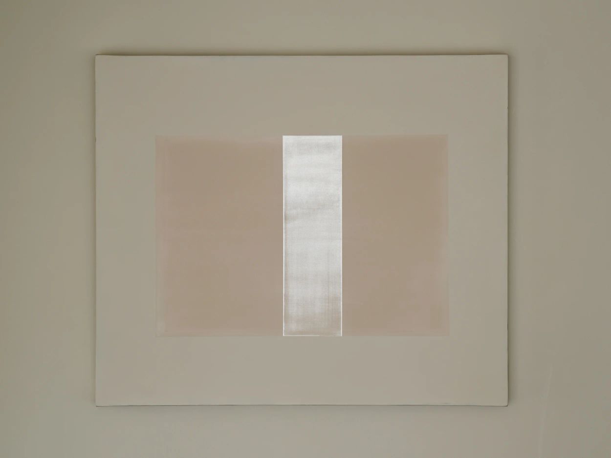 A series of six canvases, Yoondongju’s Sky, is intended to be viewed in one horizontal line. The rectangular paintings vary in size and orientation, and share a palette of gentle blues and pinkish creams and whites. Bands of colour suggest the horizon and the changing tones of the sky. The series references early 20th century poet Yun Dong-ju, whose poetry collection, Sky, Wind and Stars, lends its title to this show.