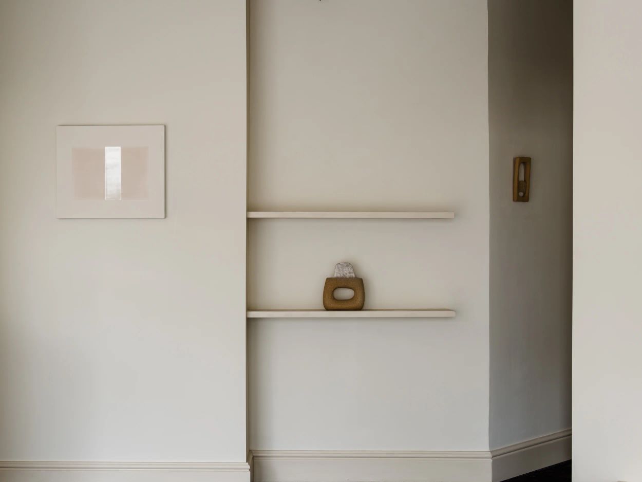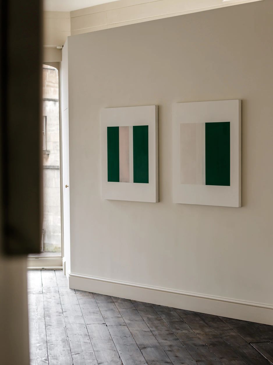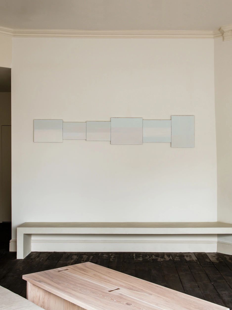 A series of six canvases, Yoondongju’s Sky, is intended to be viewed in one horizontal line. The rectangular paintings vary in size and orientation, and share a palette of gentle blues and pinkish creams and whites. Bands of colour suggest the horizon and the changing tones of the sky. The series references early 20th century poet Yun Dong-ju, whose poetry collection, Sky, Wind and Stars, lends its title to this show.