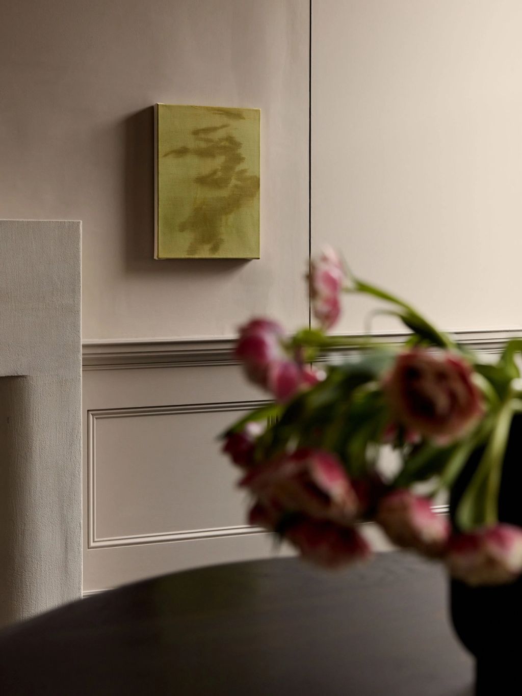 Indigo voyager, you lift above green, travel in horizontal time, with silent messages. Deep green grows behind you, smudged over a paler green. The gaps between are soothing, not anxious, as ideas seem to float past. Emissary (2025), like many of Nicky Hodges’ paintings is quiet, but it is not easy. It has activity within the quietude; a thinking mind behind a calm face. And don’t we seek both – the beauty and tranquillity of abstraction that frees us from the tyranny of representation, and yet also the sense that something is yearning to be represented at the edge of the image – or no – from within it.