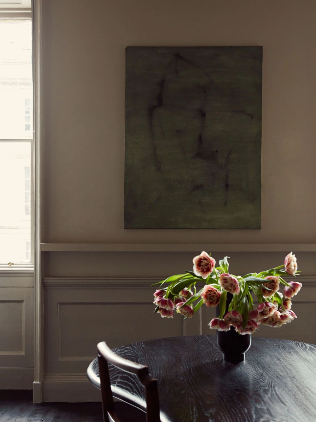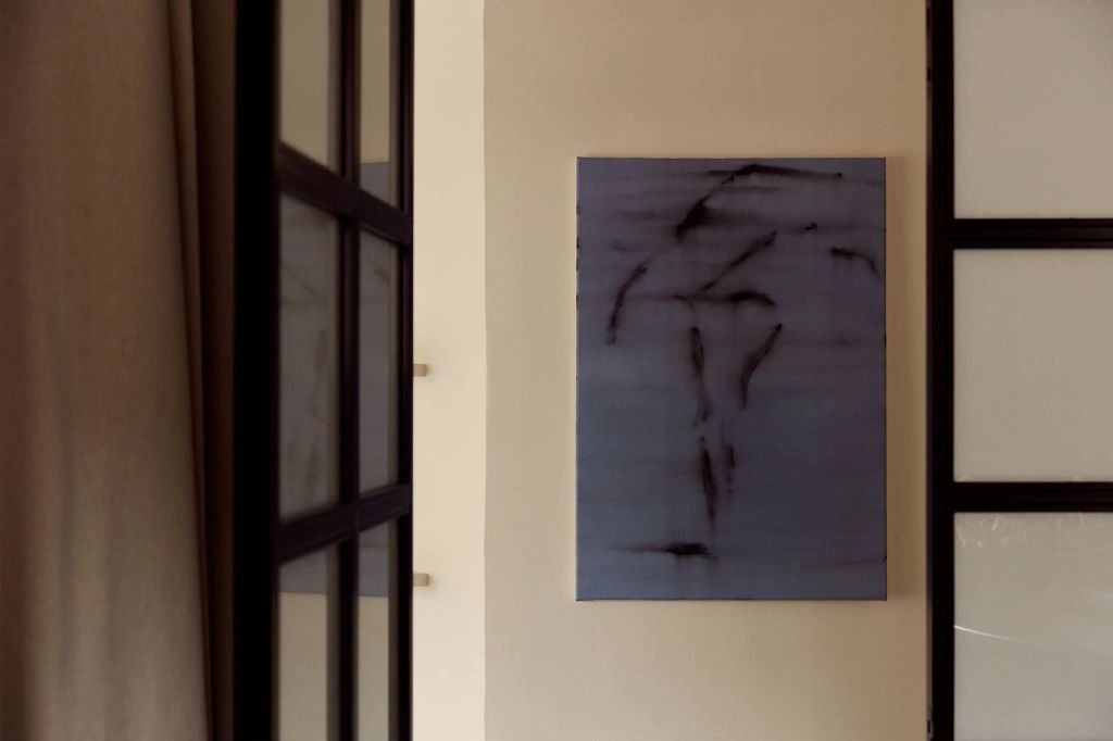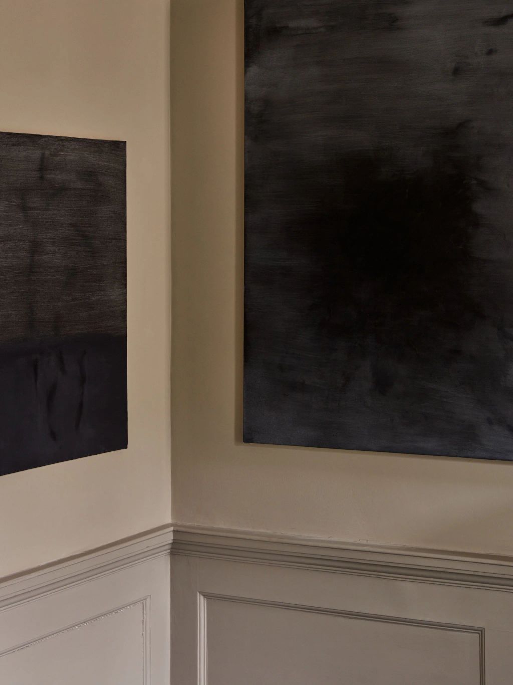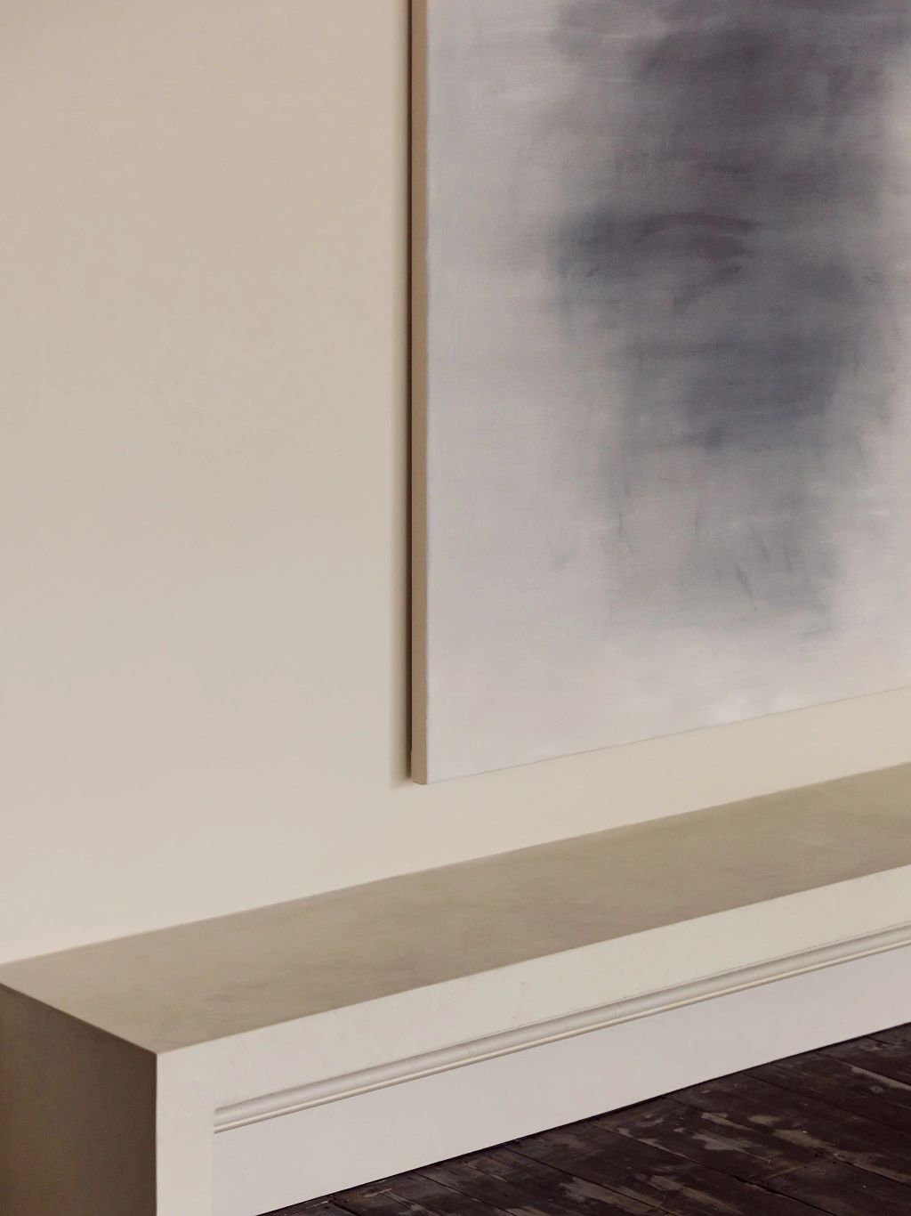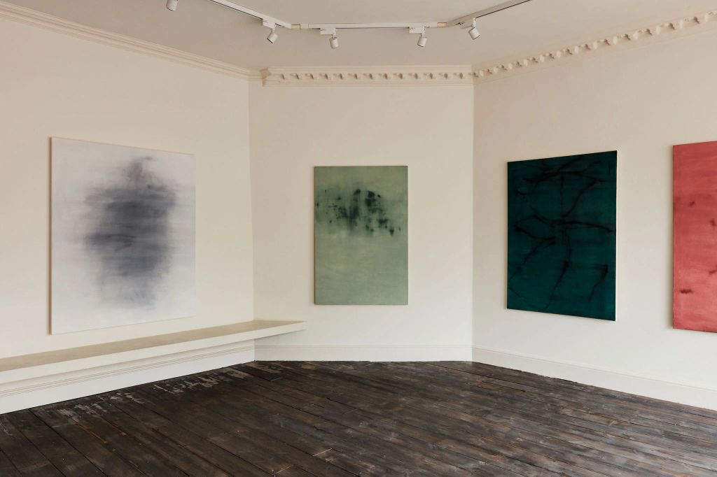 A range of techniques was utilised to create the atmospheric compositions, including spontaneous, sweeping gestures and gentle movements with softer brushes to blur the marks, using acrylic mixed with water and applied wet on untreated canvas. Unlike Hodge’s previous work, there is a build-up of layers on some of the monochrome canvases, and across the paintings, a contrast of muted tones with brighter, more vivid hues can be discerned. “The different methods in the works enhance the sense of these paintings as being in a state of flux,” says Hodge. “My quick way of working is experimental and risky and raises questions about letting go. By allowing chance to dictate some of the composition, I feel a sense of drama when I work, and the ending is always a surprise to me.”