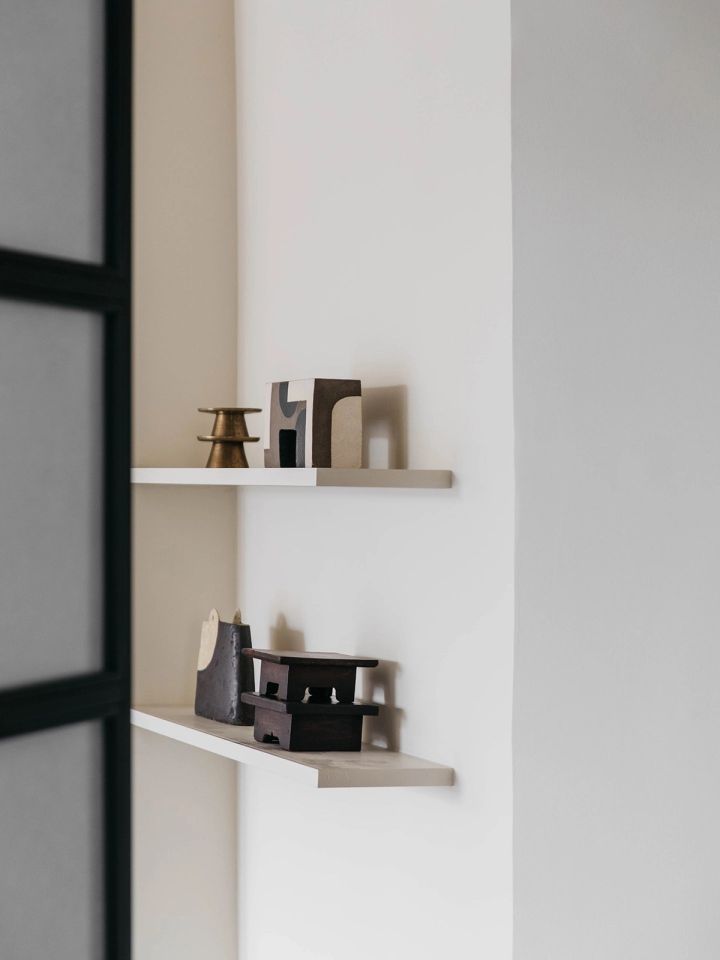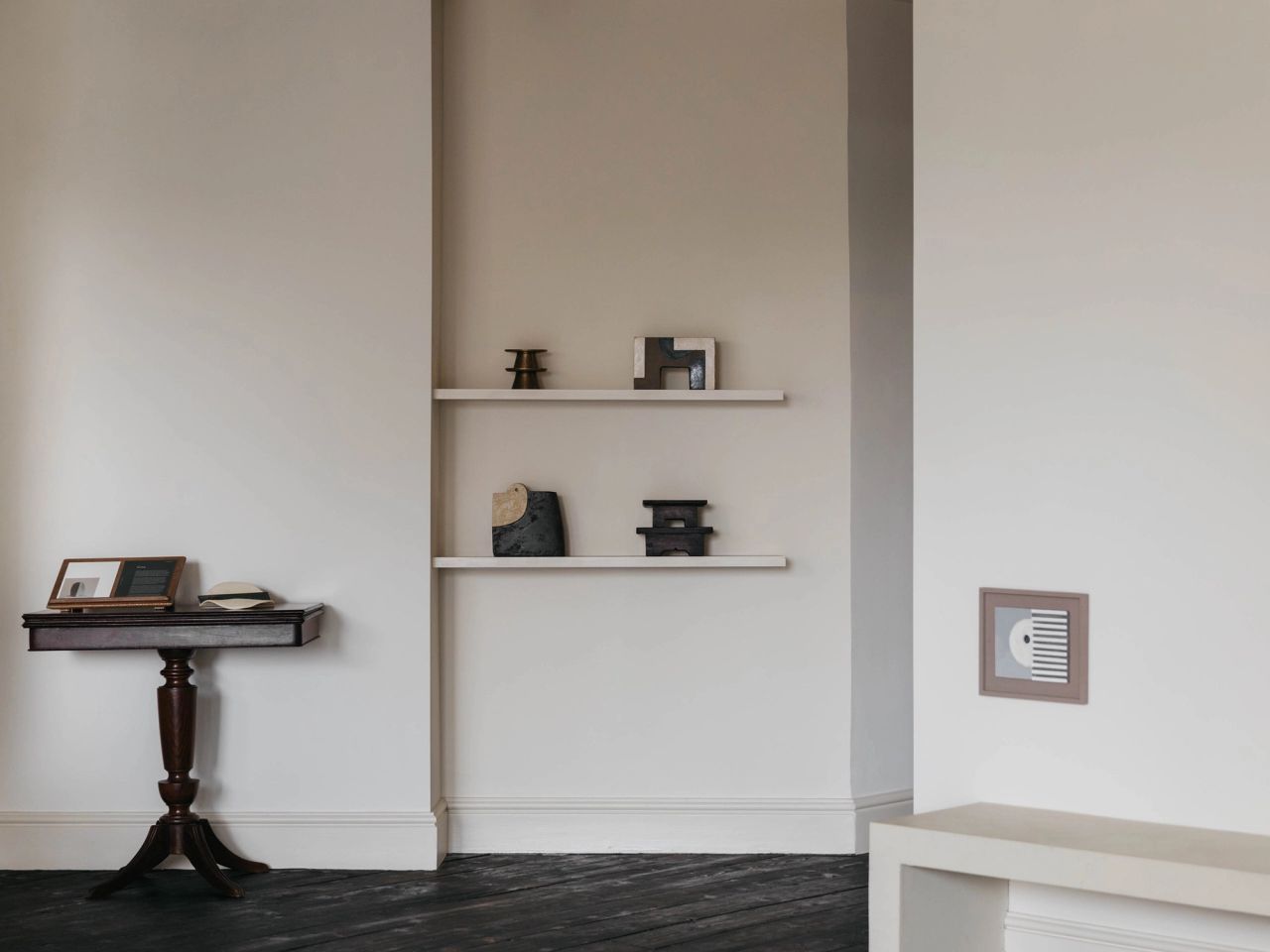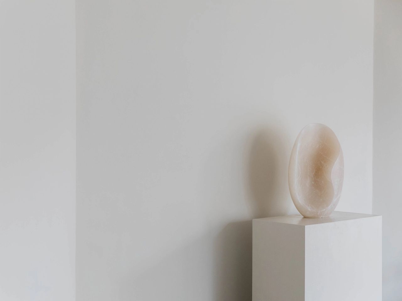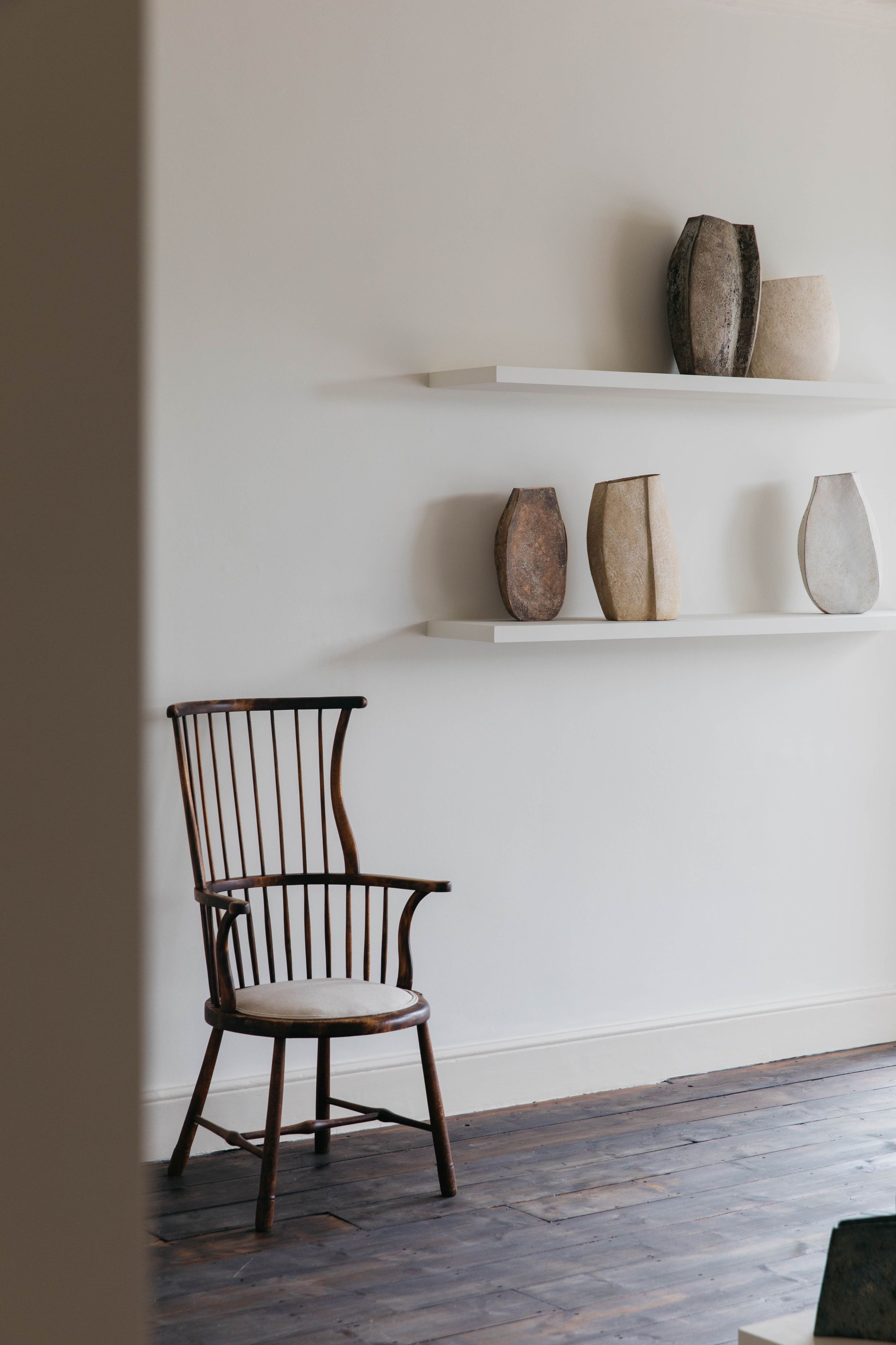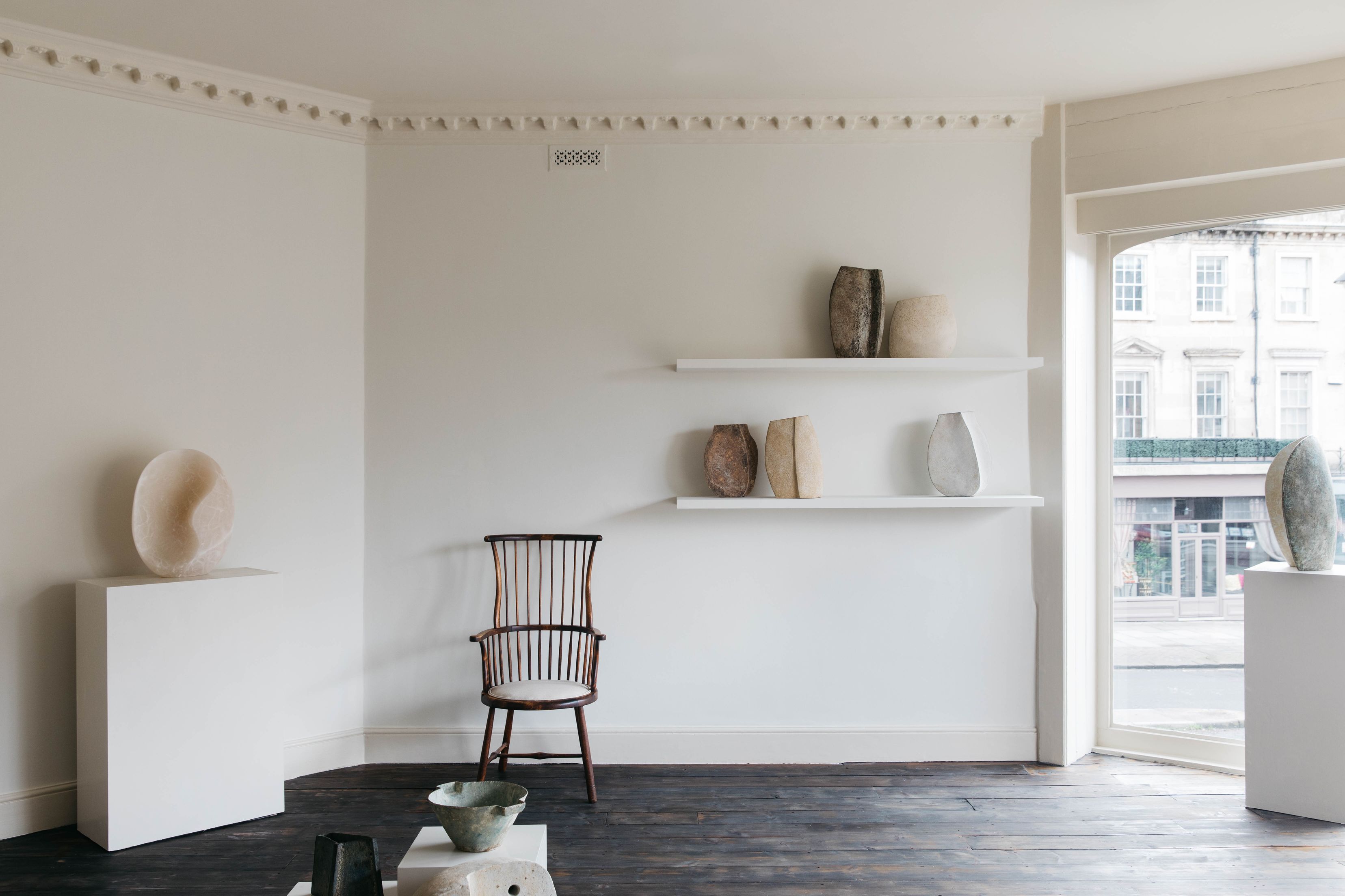 The irregular placement of Philp’s vases in the gallery, scattered across shelves and accompanied by a stick back armchair, is inspired by his nearby studio. Other vases and sculptures are raised on plinths in the windows, with three pieces clustered together in the centre of the space. Against the back wall, a large alabaster sculpture has an ethereal but arresting presence, its veined surface gently illuminated as daylight passes through its curved form.