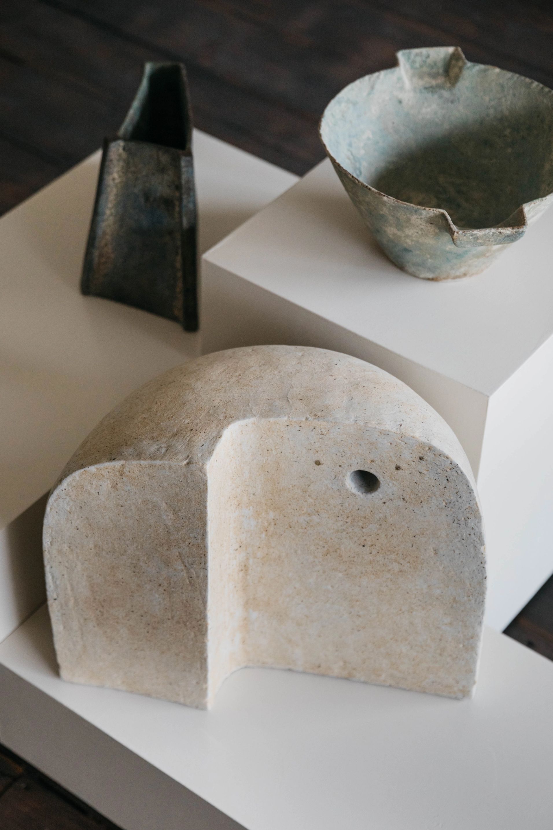 Unearthed is a solo exhibition by studio potter Paul Philp, featuring ceramics, relief works, and an alabaster sculpture, built by hand over the last 10 years in his home studio in Bath, United Kingdom. His work is informed by a fascination with ruins, antiquities, Asian art, and geology. “I’ve always had an enquiring mind about these subjects,” he says. “I have developed a vast collection of Asian and Tribal art catalogues over the years, as well as various antiquities, including an ancient Egyptian vase, a Buddhist terracotta sculpture, and hundreds of prehistoric stone artefacts, such as Native American arrow heads.”