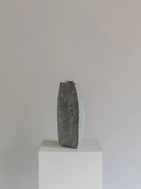 His work is the product of a methodical, disciplined process: each piece might involve four or five high-temperature firings, whereby thin layers of black clay and iron oxide, liquid white China clay, wood ash, or other glazes are applied in stages to the surface of the ceramic, creating a uniquely rich, textural patina, as if the piece has eroded organically over time. By using a mixture of clays with different shrinkage rates to build each pot, Philp encourages subtle craters and imperfections to arise during the firing, recalling the natural weathering of stone. When living in Monmouthshire, he often mixed combustible organic materials into the clay, creating dramatic fissures and fossil-like impressions.