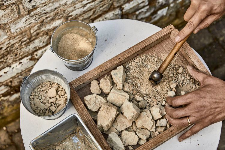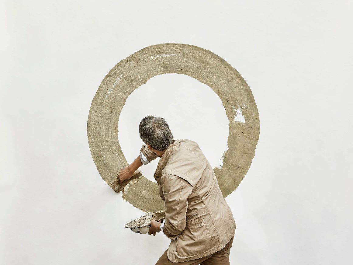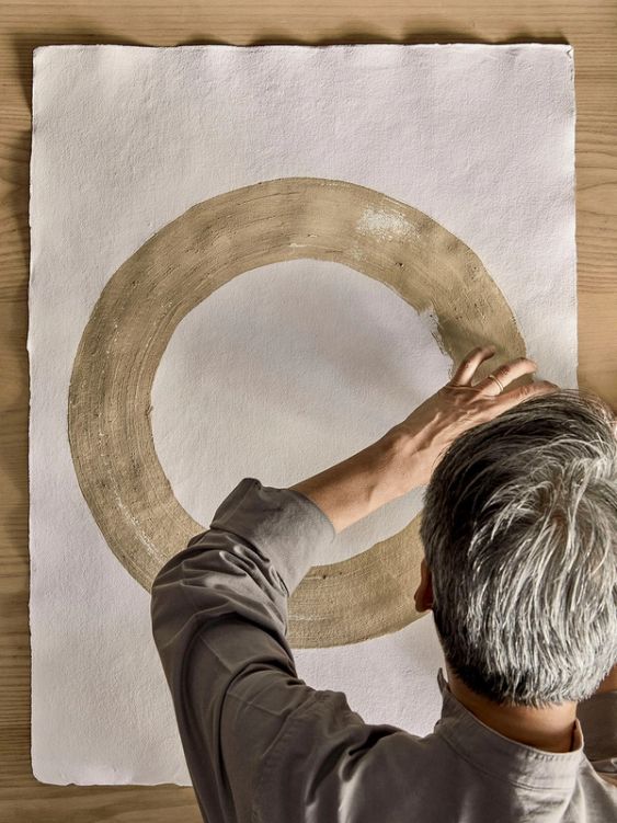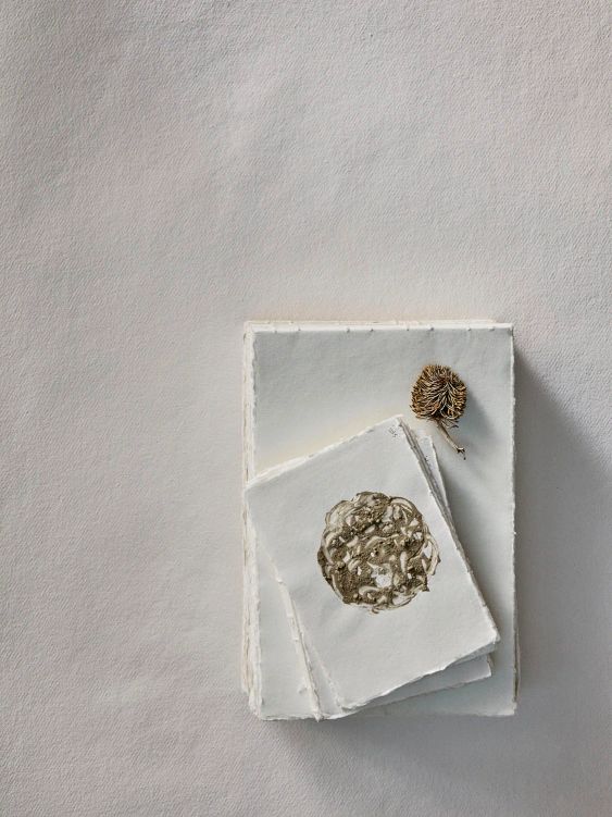 Fung often uses soil and other materials for pigment in his paintings, applying it with clumps of moss and other found natural objects. The clay he uses in Seed of Hope is a mixture of Jurassic blue clay gathered from the coast of Dorset, and light golden clay dug by hand from a quarry in the Cotswolds, revealing streaks of both hues in the final mix. For these works, Fung used recycled cotton rag paper, made from waste material from the fashion industry, as his canvas. ‘I tend to choose non-toxic, organic, biodegradable materials,’ he says. ‘This helps me engage with, and delight in, the natural world. I like the thought that my work is part of a cycle of creation and degradation, leaving no harmful impact on the environment.’